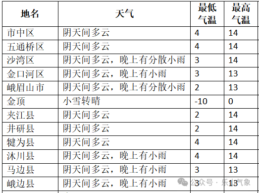 阴天间多云,晚上西部和南部山区有小雨,中高山区有雨夹雪或小雪,早上坪坝地区有雾;